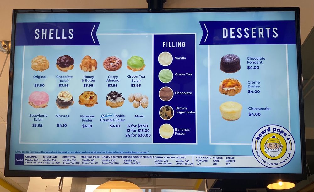 Beard Papa’s, located in Chicago, offers a delectable array of desserts, including their famous cream puffs in various sizes and flavors. The Mini Cream Puffs come in sets of 6, 12, or 24, filled with a choice of cream. Their dessert menu features classics like Bananas Foster, Cheesecake, Chocolate Fondant, and Creme Brulee. Additionally, the Mashle X Beard Papa's Collaboration introduces innovative puff flavors like Dott Barret, Finn Ames, and Lance Crown. The cozy bakery provides street parking, free Wi-Fi, and gender-neutral restrooms, making it a convenient and inclusive spot to satisfy your sweet cravings. Don't miss out on indulging in these delightful treats at Beard Papa’s!